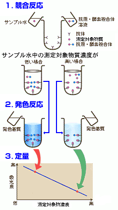 抗体または抗原を酵素で標識化することにより対象物質を高感度に測定する方法で、プラスチックスなどの固相に結合させた抗原または抗体を用いることで、非結合物を除去したり、新たな試薬と反応させることができます。EIA(Enzyme Immunoassay:酵素免疫測定法) という用語もありますが、この場合は固相を用いない系も含む広い概念で、RIA(Radio Immunoassay:ラジオイムノアッセイ)に対応する言葉です。