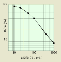 近年、非イオン界面活性剤の生産量は陰イオン界面活性剤と同程度にまで増加しています。アルコールエトキシレート(AE,POER)は代表的な非イオン界面活性剤のひとつであり、家庭用合成洗剤に配合されるなど特に生産量が増加しています。AEの生分解性は比較的良好ですが、起泡性が強く、水道水質の管理上、監視の必要性が指摘されています。水道水中の非イオン界面活性剤の水質基準は、平成15年5月の「水道基準に関する厚生労働省令」改正により「0.02mg/L以下であること」と定められています。