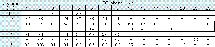 POEP)の総量を測定する方法であり、AEとAPEの分別定量はできません。また、煩雑なクリーンアップ、有害な有機溶剤(トルエン)による抽出操作が必要なほか、酸化エチレン鎖(EO鎖)長による感度のばらつきなどの問題が指摘されています。 |