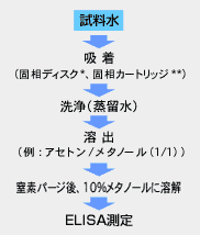 固相カートリッジ(NEXUS*)はジクロロメタン10mL、メタノール5mLおよび精製水5mLで処理(コンディショニング)しておきます。1Lの試料水を通水します。精製水5mLと50%メタノール5mLでカートリッジを洗浄します。吸引してカートリッジを脱水します。ジクロルメタン6mLで溶出し、濃縮します。